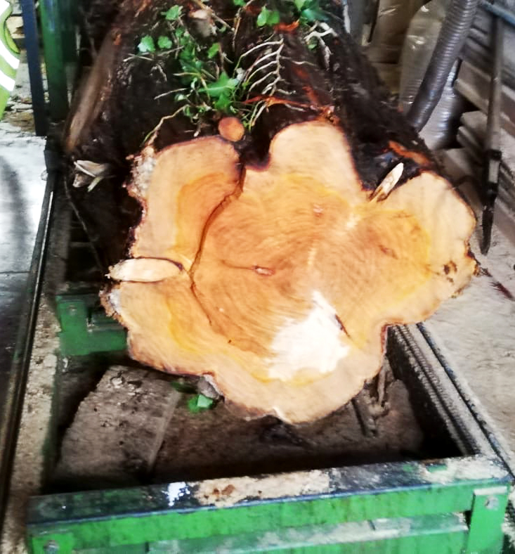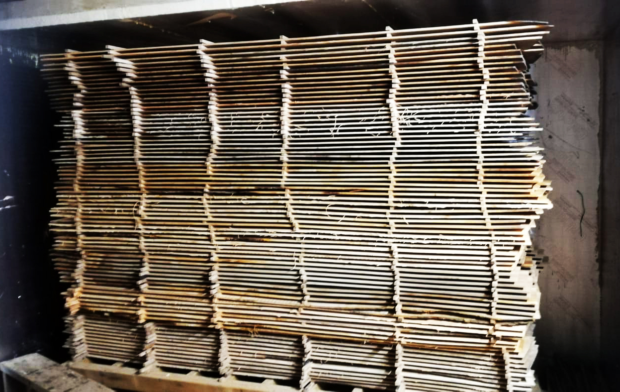 Here the wood is delivered, cut on a track saw and then kiln-dried.